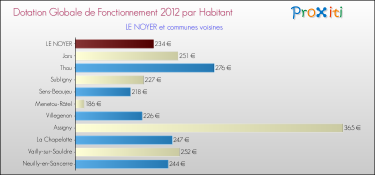 Le graphique ci dessous indique la Dotation Globale de Fonctionnement accordée par habitant à Le Noyer en 2012 par rapport aux communes voisines.