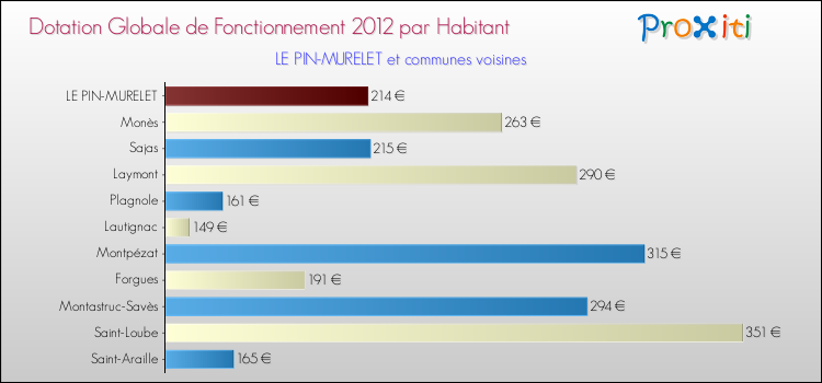 Le graphique ci dessous indique la Dotation Globale de Fonctionnement accordée par habitant à Le Pin-Murelet en 2012 par rapport aux communes voisines.