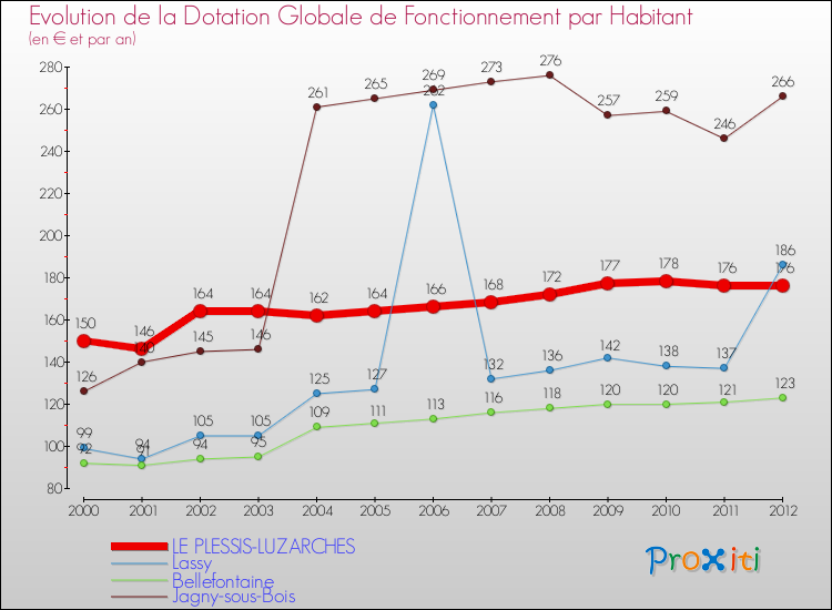 Le graphique ci dessous indique la Dotation Globale de Fonctionnement accordée par habitant à Le Plessis-Luzarches en 2012 par rapport aux communes voisines.