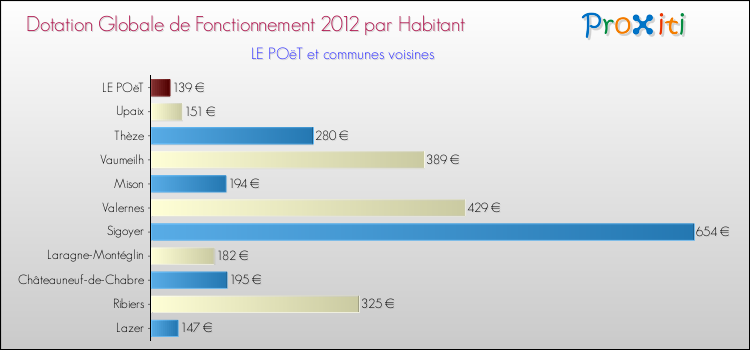 Le graphique ci dessous indique la Dotation Globale de Fonctionnement accordée par habitant à Le Poët en 2012 par rapport aux communes voisines.