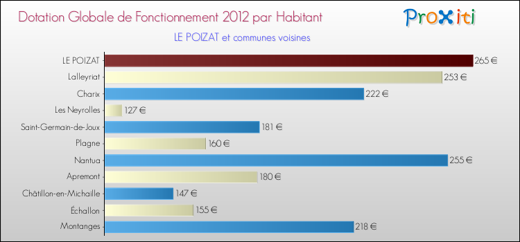 Le graphique ci dessous indique la Dotation Globale de Fonctionnement accordée par habitant à Le Poizat en 2012 par rapport aux communes voisines.