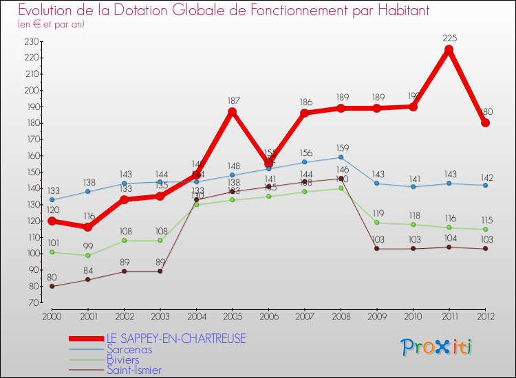 Dans le même temps, la Dotation Globale de Fonctionnement accordée aux communes françaises similaires à Le Sappey-en-Chartreuse était de 214 € par habitant, en 2012.