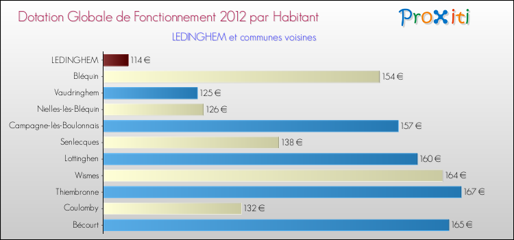 Le graphique ci dessous indique la Dotation Globale de Fonctionnement accordée par habitant à Ledinghem en 2012 par rapport aux communes voisines.