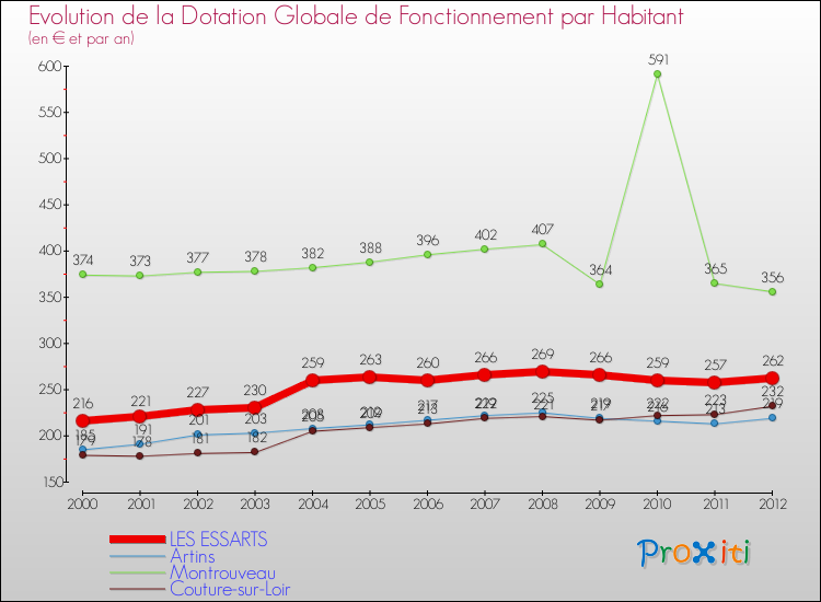 Dans le même temps, la Dotation Globale de Fonctionnement accordée aux communes françaises similaires à Les Essarts était de 228 € par habitant, en 2012.