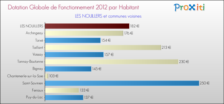 Le graphique ci dessous indique la Dotation Globale de Fonctionnement accordée par habitant à Les Nouillers en 2012 par rapport aux communes voisines.