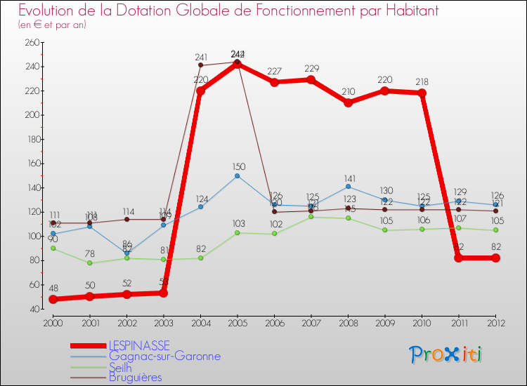 A Lespinasse, en 2012 un habitant reçoit donc moins de subventions au titre de la DGF que pour des communes similaires.