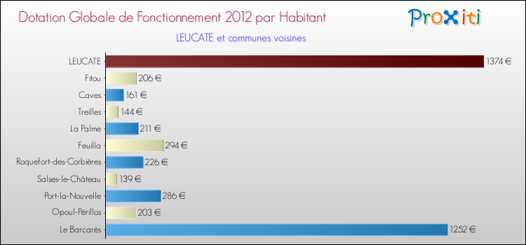 Le graphique ci dessous indique la Dotation Globale de Fonctionnement accordée par habitant à Leucate en 2012 par rapport aux communes voisines.
