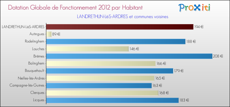 Le graphique ci dessous indique la Dotation Globale de Fonctionnement accordée par habitant à Landrethun-lès-Ardres en 2012 par rapport aux communes voisines.