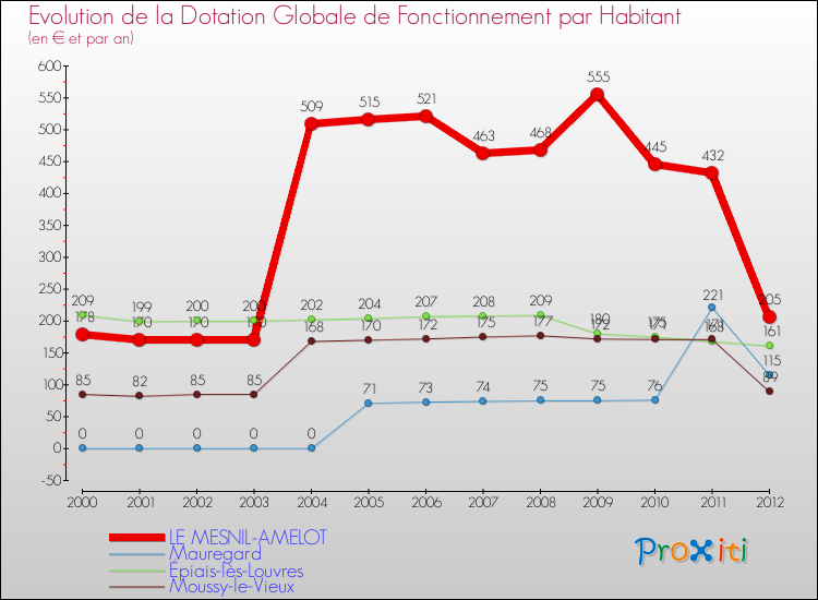 Le graphique ci dessous indique la Dotation Globale de Fonctionnement accordée par habitant à Le Mesnil-Amelot en 2012 par rapport aux communes voisines.