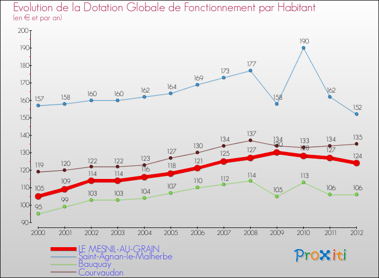 Le graphique ci dessous indique la Dotation Globale de Fonctionnement accordée par habitant à Le Mesnil-au-Grain en 2012 par rapport aux communes voisines.