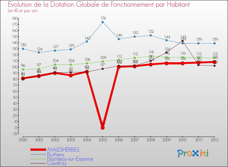 Dans le même temps, la Dotation Globale de Fonctionnement accordée aux communes françaises similaires à Malesherbes était de 203 € par habitant, en 2012.