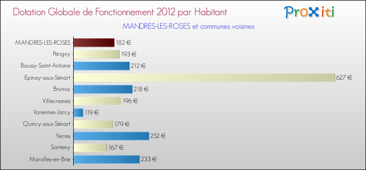 Le graphique ci dessous indique la Dotation Globale de Fonctionnement accordée par habitant à Mandres-les-Roses en 2012 par rapport aux communes voisines.