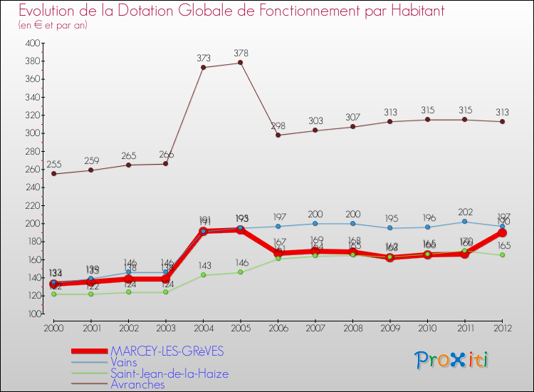 Le graphique ci dessous indique la Dotation Globale de Fonctionnement accordée par habitant à Marcey-les-Grèves en 2012 par rapport aux communes voisines.