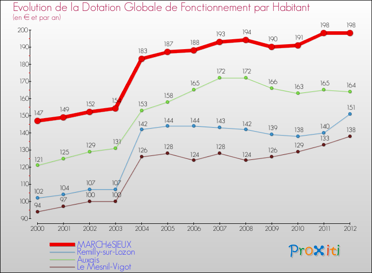 Dans le même temps, la Dotation Globale de Fonctionnement accordée aux communes françaises similaires à Marchésieux était de 214 € par habitant, en 2012.