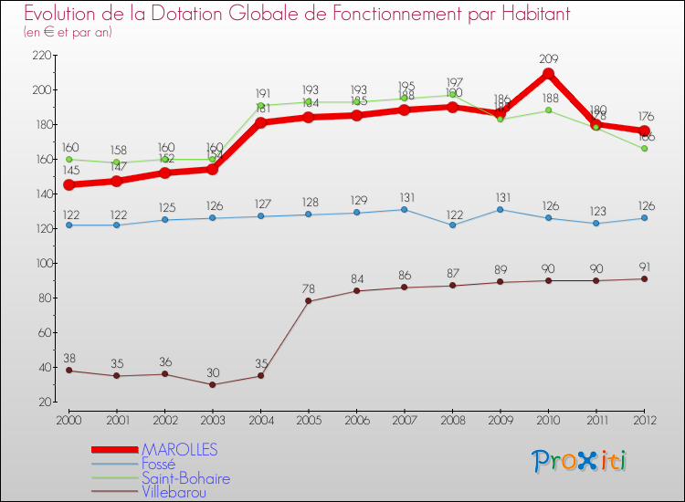 Dans le même temps, la Dotation Globale de Fonctionnement accordée aux communes françaises similaires à Marolles était de 173 € par habitant, en 2012.