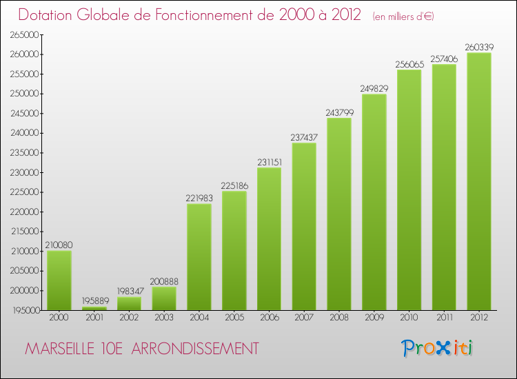 En effet, la dotation globale de fonctionnement versée par l'état en 2012 à la seule commune de Marseille 10e Arrondissement était de : 260 339 000 € au total.