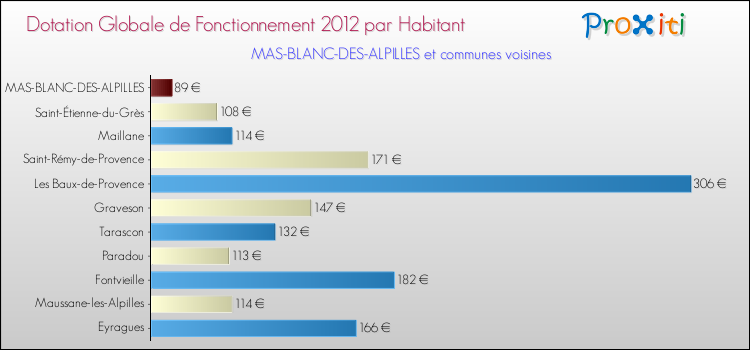 Le graphique ci dessous indique la Dotation Globale de Fonctionnement accordée par habitant à Mas-Blanc-des-Alpilles en 2012 par rapport aux communes voisines.
