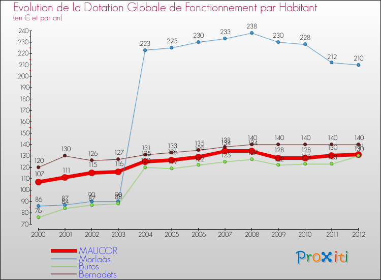 Dans le même temps, la Dotation Globale de Fonctionnement accordée aux communes françaises similaires à Maucor était de 214 € par habitant, en 2012.