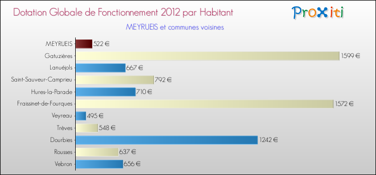 Le graphique ci dessous indique la Dotation Globale de Fonctionnement accordée par habitant à Meyrueis en 2012 par rapport aux communes voisines.