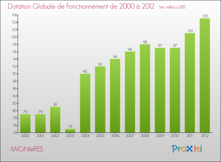 Dans le même temps, la Dotation Globale de Fonctionnement accordée aux communes françaises similaires à Mignières était de 214 € par habitant, en 2012.