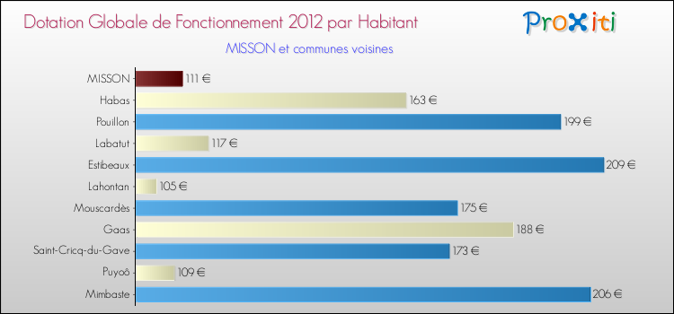 Dans le même temps, la Dotation Globale de Fonctionnement accordée aux communes françaises similaires à Misson était de 173 € par habitant, en 2012.