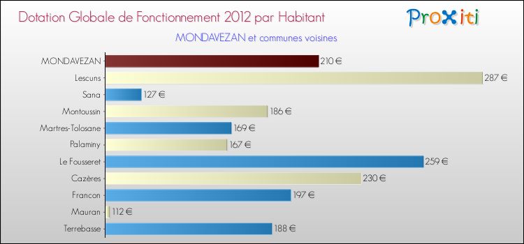 Le graphique ci dessous indique la Dotation Globale de Fonctionnement accordée par habitant à Mondavezan en 2012 par rapport aux communes voisines.