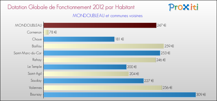Dans le même temps, la Dotation Globale de Fonctionnement accordée aux communes françaises similaires à Mondoubleau était de 173 € par habitant, en 2012.