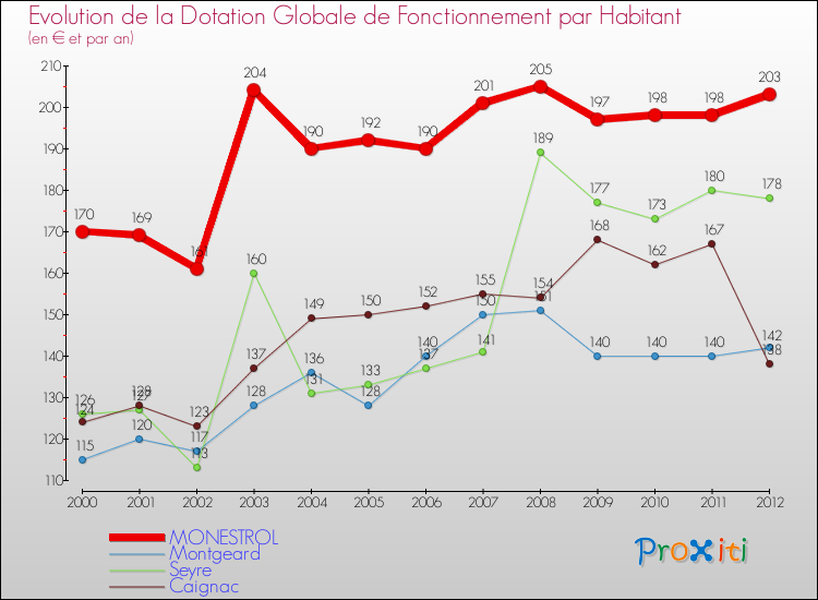 Dans le même temps, la Dotation Globale de Fonctionnement accordée aux communes françaises similaires à Monestrol était de 228 € par habitant, en 2012.