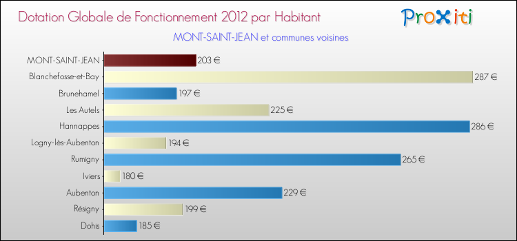 Le graphique ci dessous indique la Dotation Globale de Fonctionnement accordée par habitant à Mont-Saint-Jean en 2012 par rapport aux communes voisines.