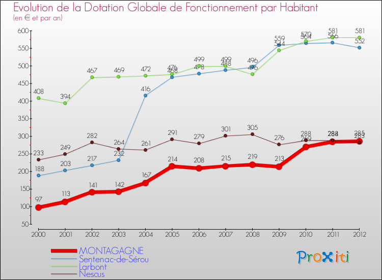 Dans le même temps, la Dotation Globale de Fonctionnement accordée aux communes françaises similaires à Montagagne était de 232 € par habitant, en 2012.