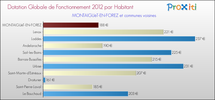 Le graphique ci dessous indique la Dotation Globale de Fonctionnement accordée par habitant à Montaiguët-en-Forez en 2012 par rapport aux communes voisines.