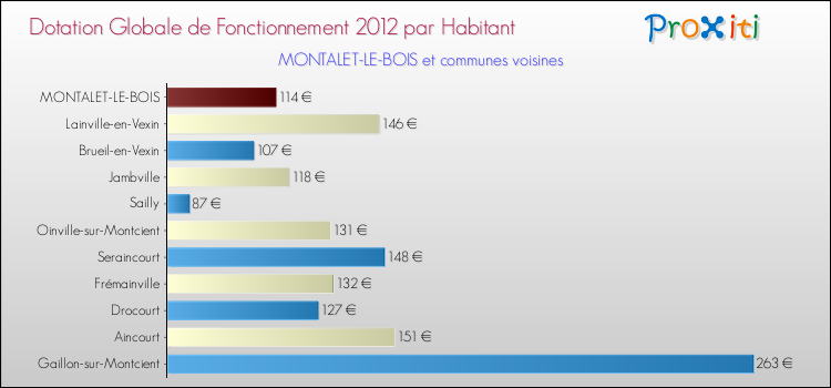 Le graphique ci dessous indique la Dotation Globale de Fonctionnement accordée par habitant à Montalet-le-Bois en 2012 par rapport aux communes voisines.