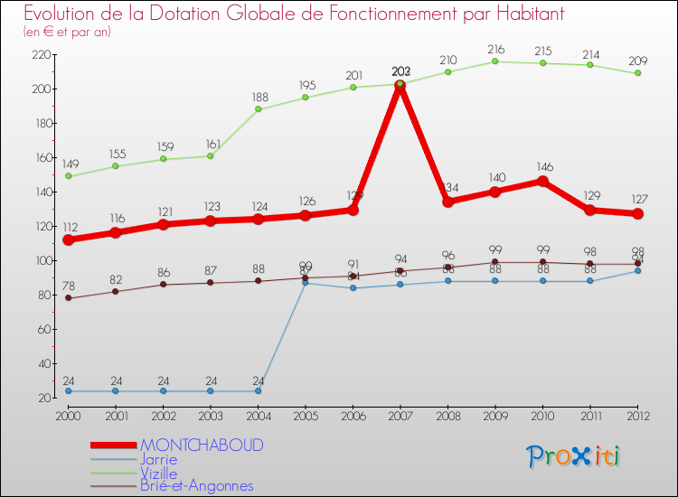 Dans le même temps, la Dotation Globale de Fonctionnement accordée aux communes françaises similaires à Montchaboud était de 181 € par habitant, en 2012.