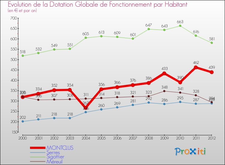 Dans le même temps, la Dotation Globale de Fonctionnement accordée aux communes françaises similaires à Montclus était de 232 € par habitant, en 2012.