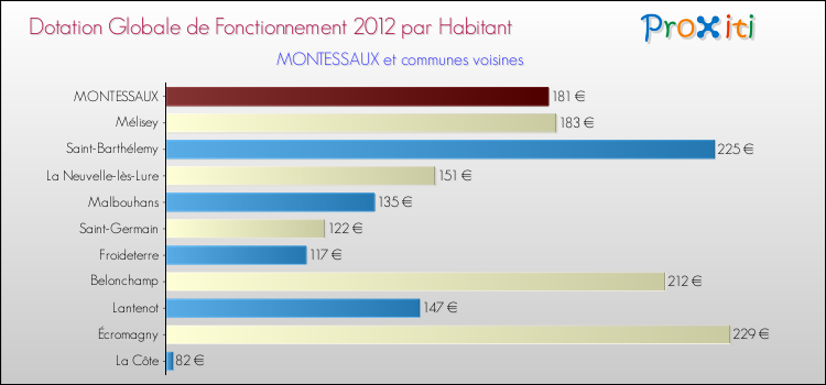 Le graphique ci dessous indique la Dotation Globale de Fonctionnement accordée par habitant à Montessaux en 2012 par rapport aux communes voisines.