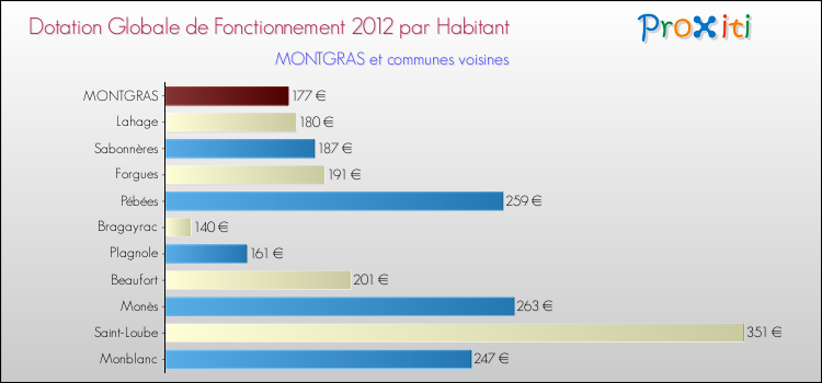 Le graphique ci dessous indique la Dotation Globale de Fonctionnement accordée par habitant à Montgras en 2012 par rapport aux communes voisines.