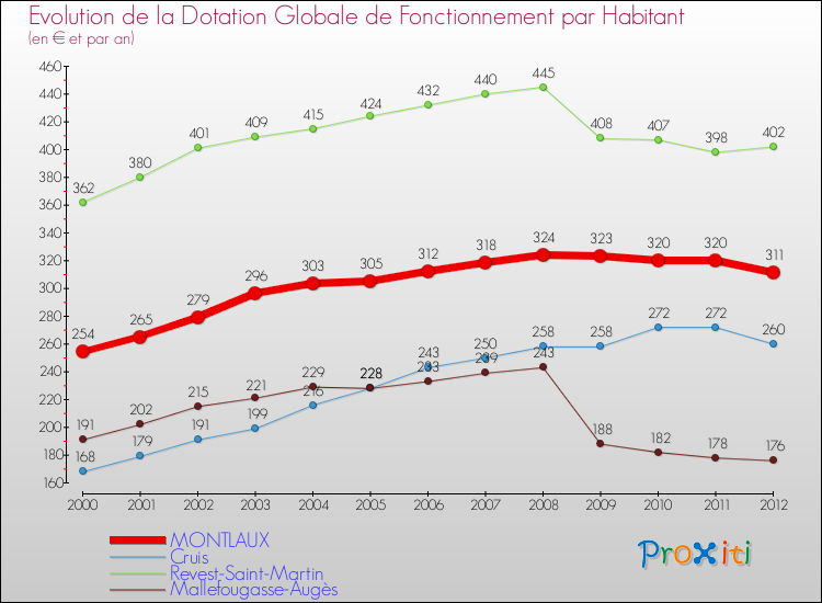 Dans le même temps, la Dotation Globale de Fonctionnement accordée aux communes françaises similaires à Montlaux était de 228 € par habitant, en 2012.