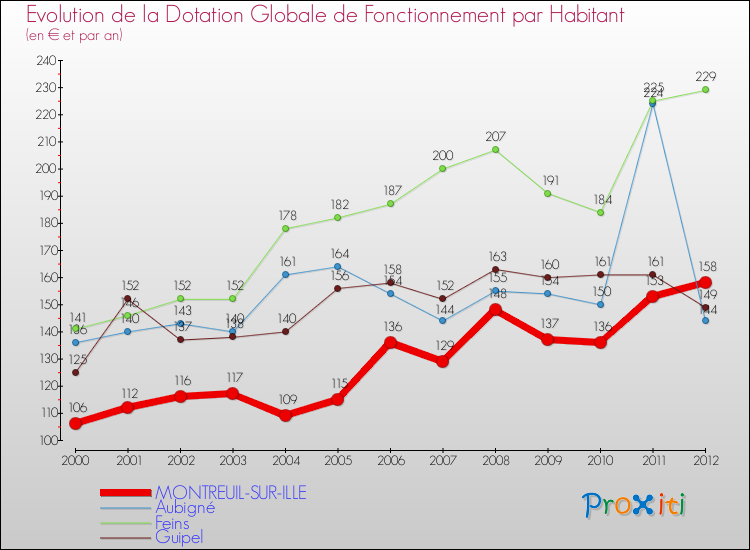 Dans le même temps, la Dotation Globale de Fonctionnement accordée aux communes françaises similaires à Montreuil-sur-Ille était de 183 € par habitant, en 2012.