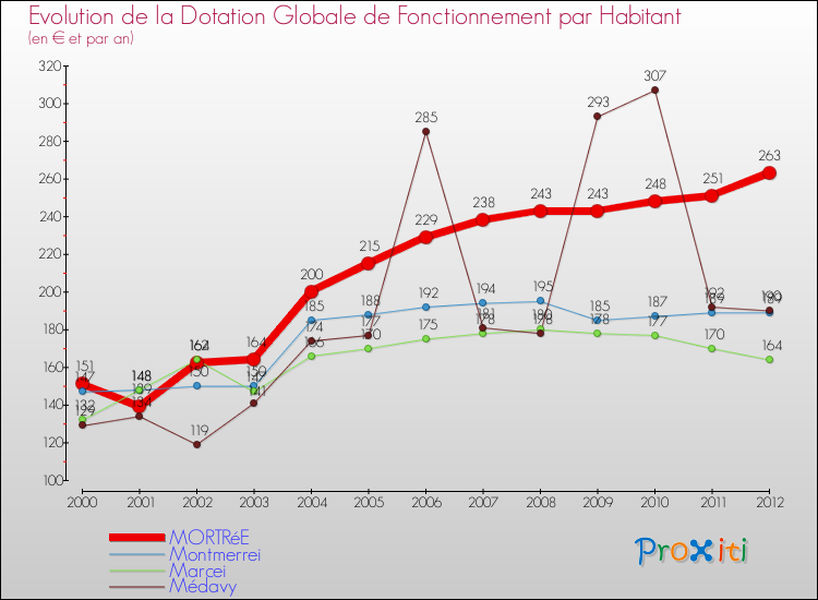 Dans le même temps, la Dotation Globale de Fonctionnement accordée aux communes françaises similaires à Mortrée était de 214 € par habitant, en 2012.