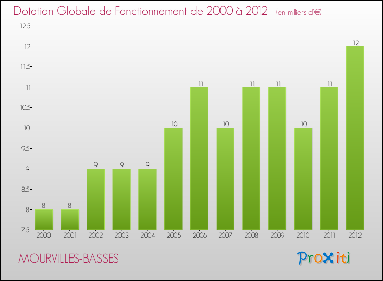 A Mourvilles-Basses, en 2012 un habitant reçoit donc moins de subventions au titre de la DGF que pour des communes similaires.