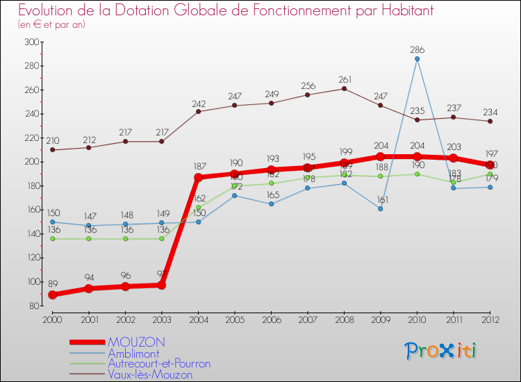 Dans le même temps, la Dotation Globale de Fonctionnement accordée aux communes françaises similaires à Mouzon était de 236 € par habitant, en 2012.