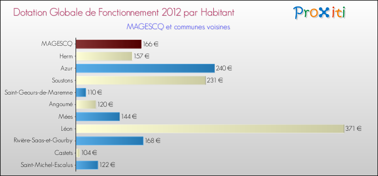 Le graphique ci dessous indique la Dotation Globale de Fonctionnement accordée par habitant à Magescq en 2012 par rapport aux communes voisines.