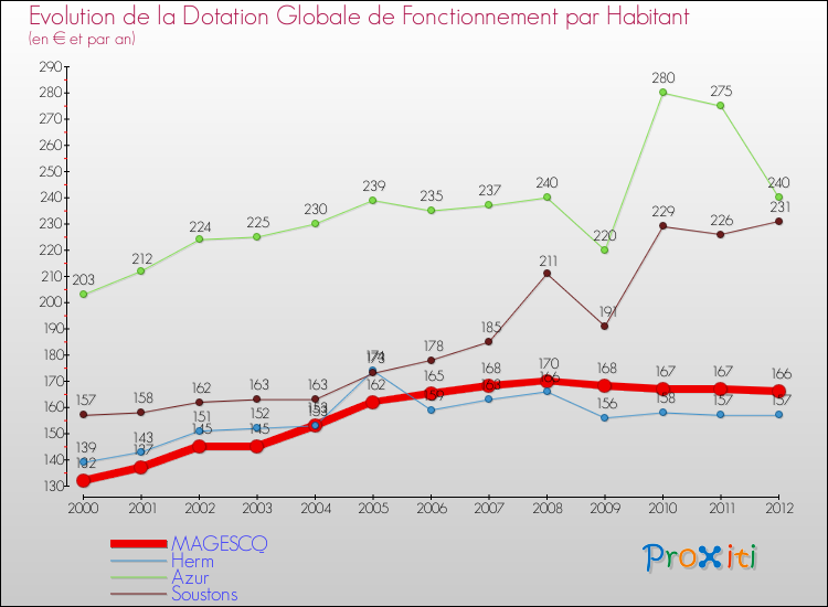 A Magescq, en 2012 un habitant reçoit donc moins de subventions au titre de la DGF que pour des communes similaires.