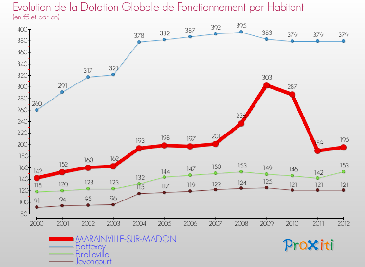 Dans le même temps, la Dotation Globale de Fonctionnement accordée aux communes françaises similaires à Marainville-sur-Madon était de 232 € par habitant, en 2012.
