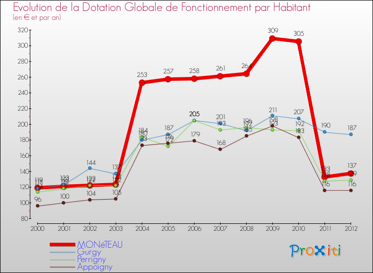 Dans le même temps, la Dotation Globale de Fonctionnement accordée aux communes françaises similaires à Monéteau était de 192 € par habitant, en 2012.