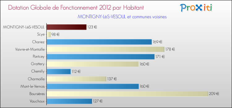 Le graphique ci dessous indique la Dotation Globale de Fonctionnement accordée par habitant à Montigny-lès-Vesoul en 2012 par rapport aux communes voisines.