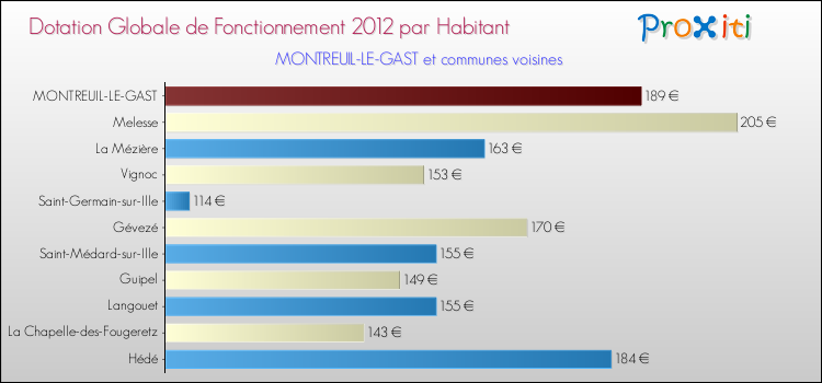 Le graphique ci dessous indique la Dotation Globale de Fonctionnement accordée par habitant à Montreuil-le-Gast en 2012 par rapport aux communes voisines.