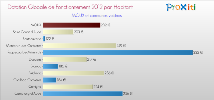 Le graphique ci dessous indique la Dotation Globale de Fonctionnement accordée par habitant à Moux en 2012 par rapport aux communes voisines.