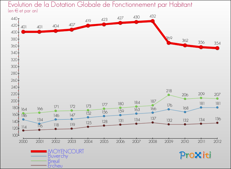 Dans le même temps, la Dotation Globale de Fonctionnement accordée aux communes françaises similaires à Moyencourt était de 200 € par habitant, en 2012.