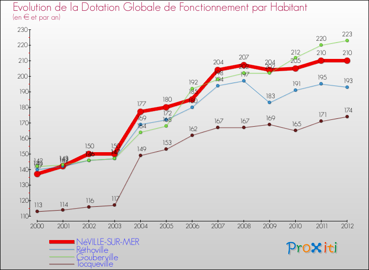 Dans le même temps, la Dotation Globale de Fonctionnement accordée aux communes françaises similaires à Néville-sur-Mer était de 232 € par habitant, en 2012.